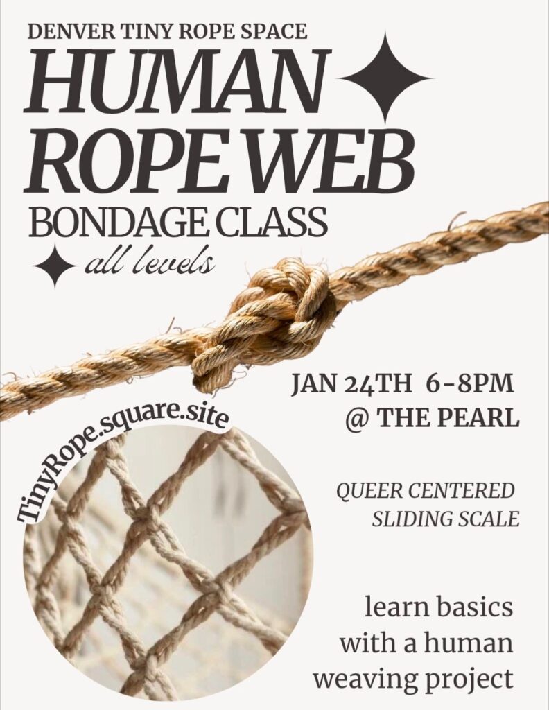 Get started in rope bondage or brush up your skills with a fun and interactive human rope web! Class will cover safety and risk basics along with a single column before beginning our web.