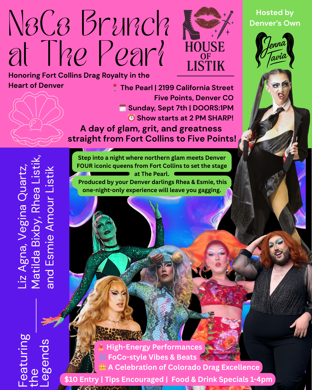 FeaturedThe Warehouse (Upper Level of The Pearl) 2195 California St, Denver, CO, United StatesStep into NoCo Brunch at The Pearl for an afternoon of fierce glamour, high-energy performances, and pure Colorado drag excellence! We’re honoring Fort Collins’ drag royalty with show-stopping looks, electric vibes, and unforgettable moments. Expect dazzling lip syncs, jaw-dropping outfits, and a celebration that bridges the best of Fort Collins and Denver. Get ready for […]